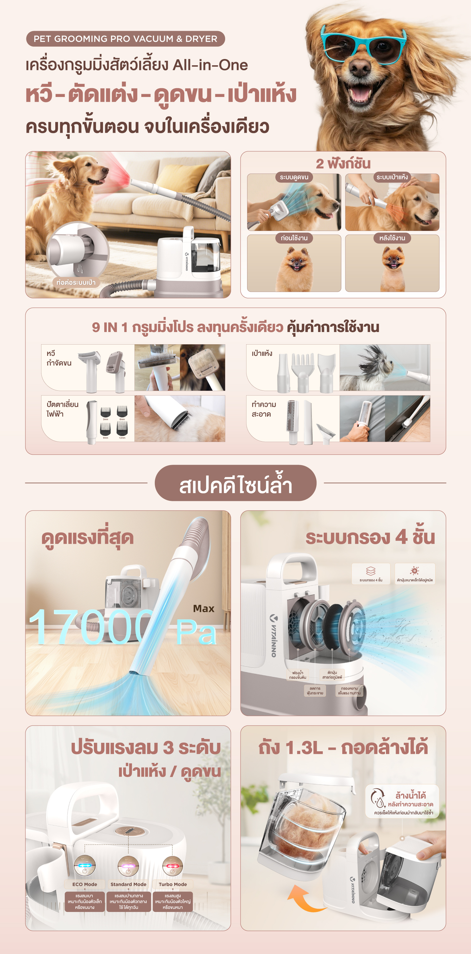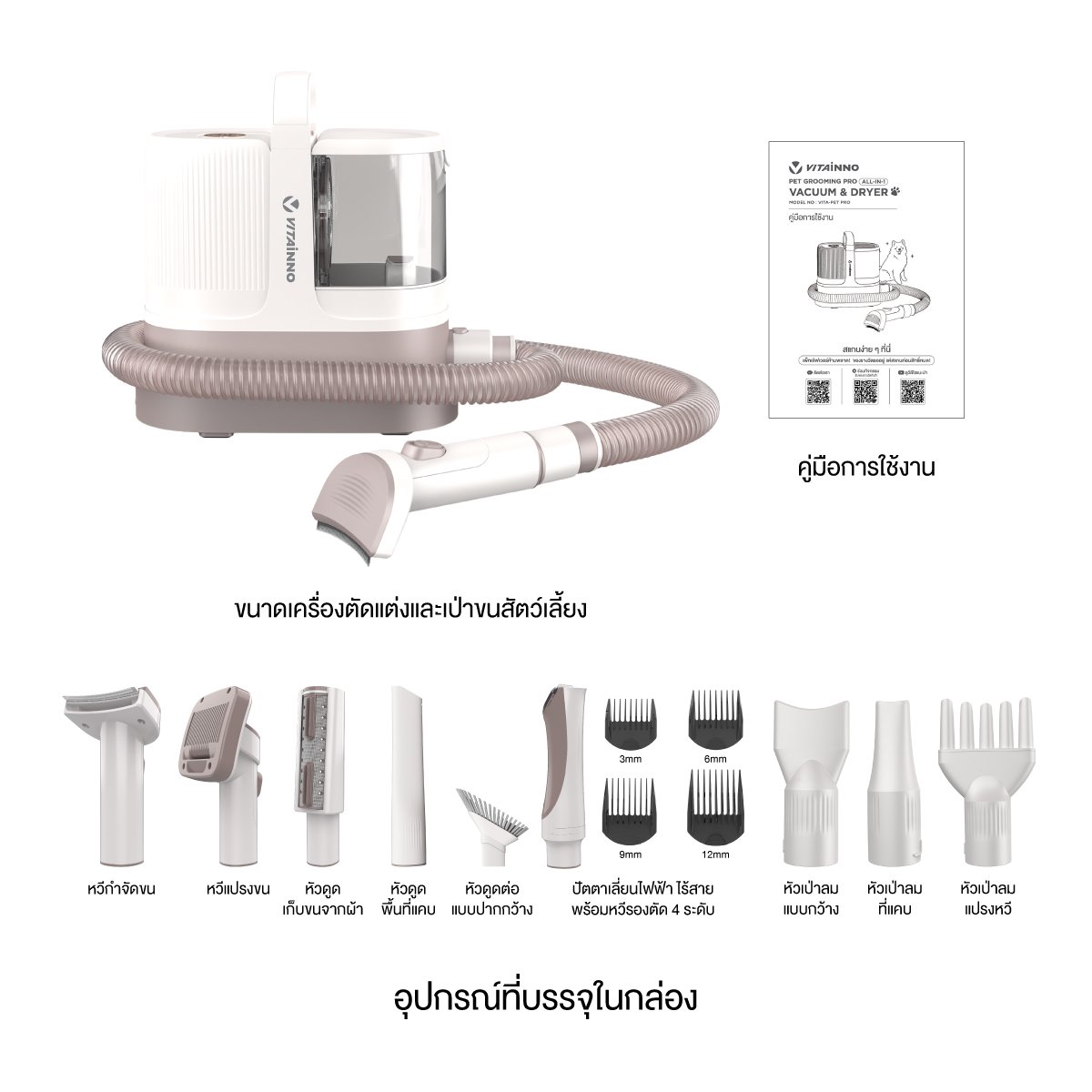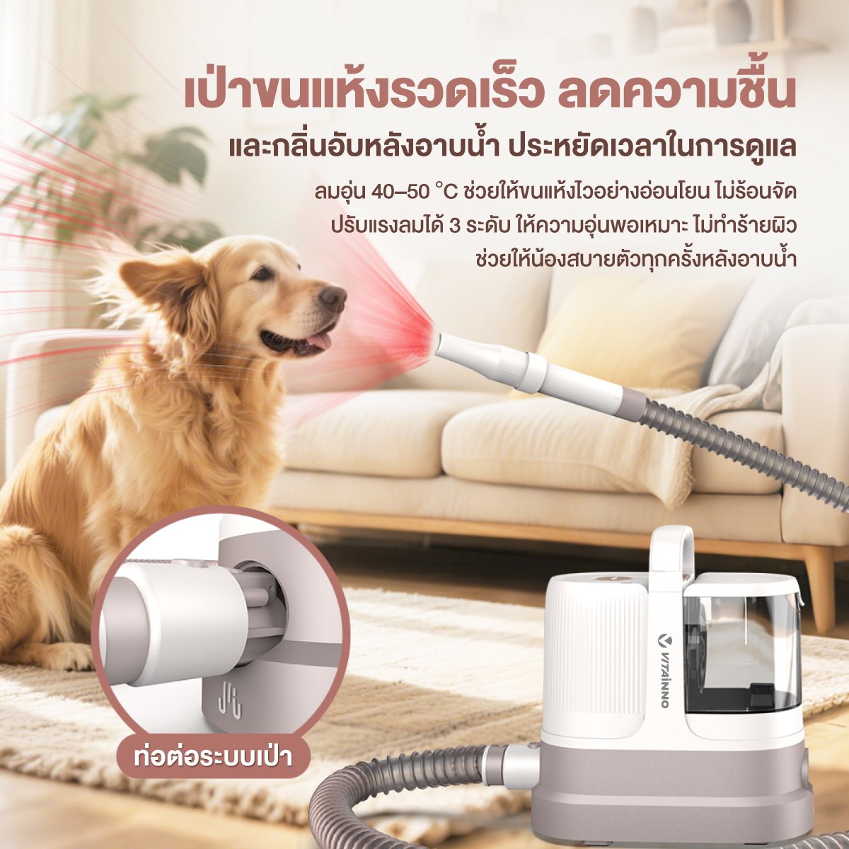 อาบน้ำน้องทีไร ขนไม่แห้งสนิท กลิ่นอับ ขนร่วงฟุ้งเต็มบ้าน แถมค่ากรุมมิ่งก็แพงขึ้นทุกเดือน VITAINNO VITA-PET PRO ช่วยให้คุณตัด–หวี–ดูดขน–เป่าแห้งได้เองที่บ้าน เครื่องเดียวเอาอยู่ทั้งความสะอาดและประหยัดเวลา
