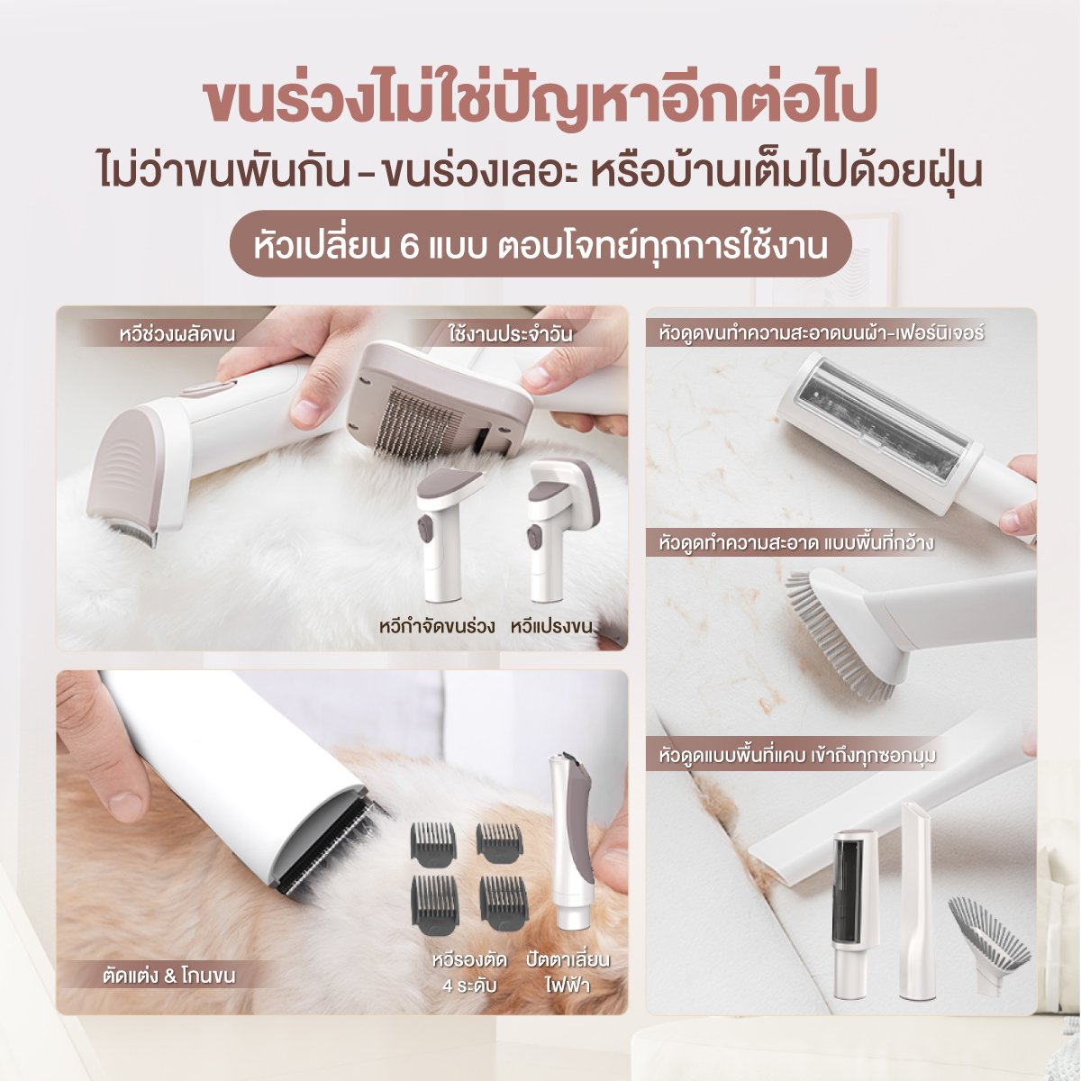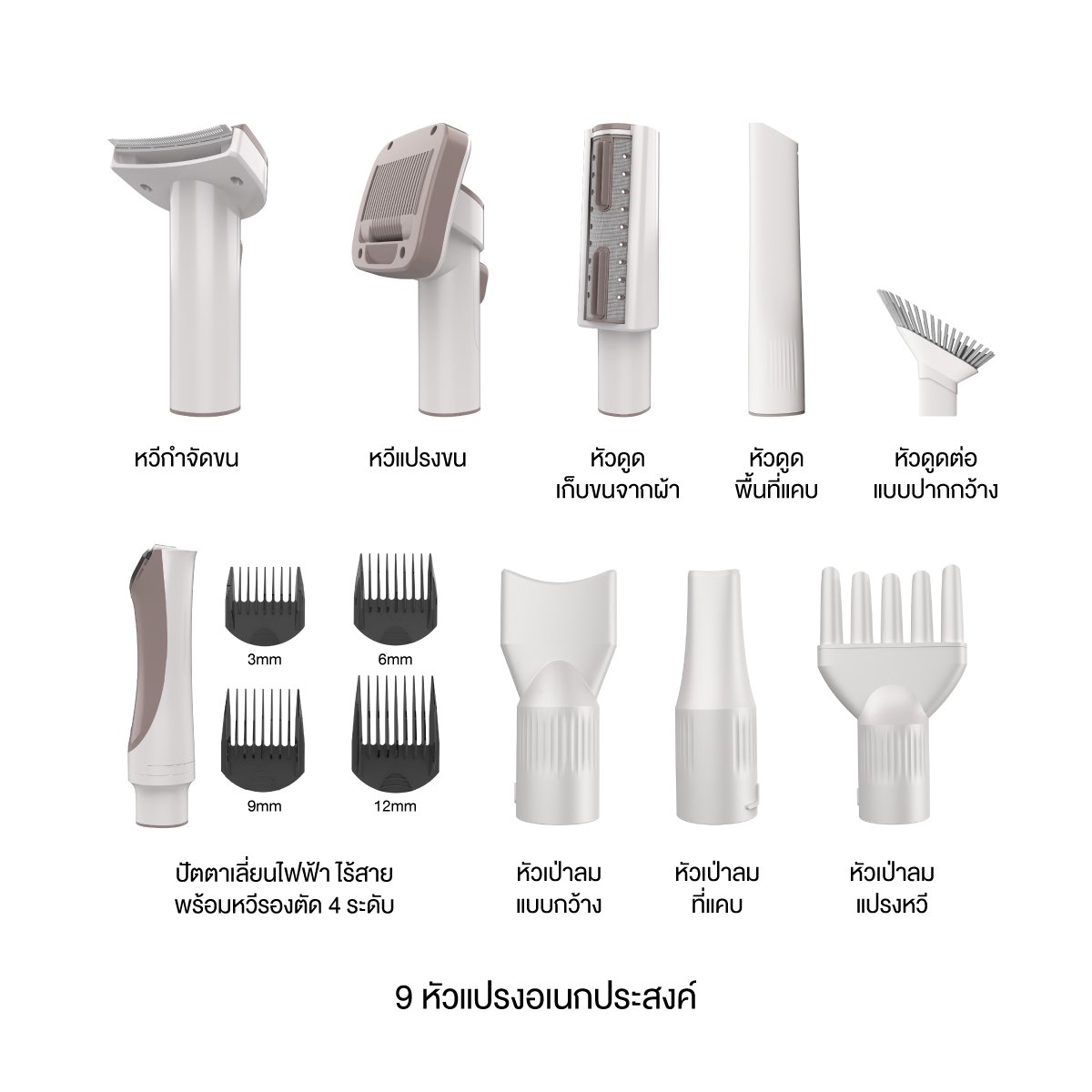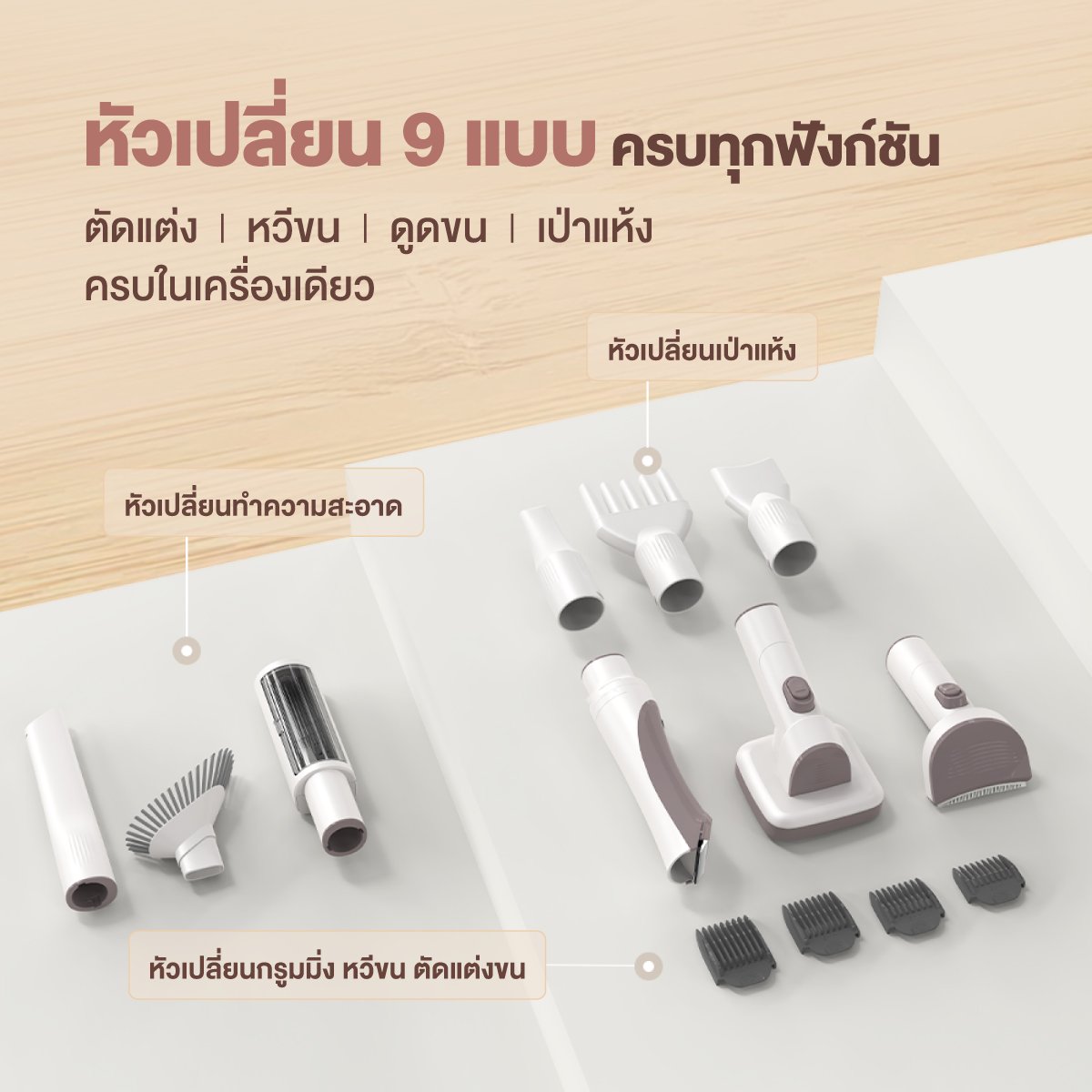 - 9-in-1 เครื่องเดียวจบทั้งกรูมมิ่ง–ตัด หวีพร้อมดูดขน และเป่าแห้ง ตัดแต่ง หวีสางขนร่วง ดูดทำความสะอาดเฟอร์นิเจอร์ และใช้หัวต่อเป่าขนแห้งไว ครบในชุดเดียว คุ้มค่าการลงทุน ประหยัดระยะยาว