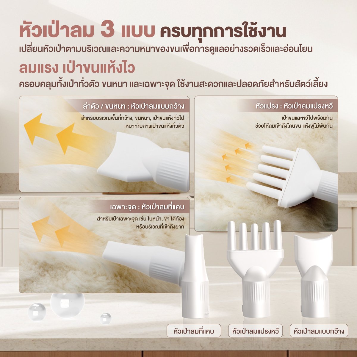 - ปรับแรงลม ความร้อน และแรงดูดได้ 3 ระดับ ใช้ได้กับทั้งขนสั้น–ขนยาว เลือกความอุ่นได้ราว 40–65 °C สบายตัว ไม่ร้อนเกินไป