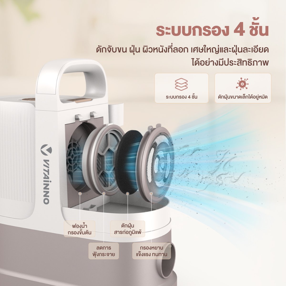 - ระบบกรอง 4 ชั้น พร้อมแผ่นกรอง HEPA ดักจับขน เส้นใย รังแค และฝุ่นละเอียด