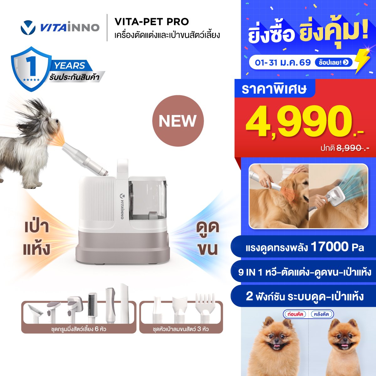 อาบน้ำน้องทีไร ขนไม่แห้งสนิท กลิ่นอับ ขนร่วงฟุ้งเต็มบ้าน แถมค่ากรุมมิ่งก็แพงขึ้นทุกเดือน VITAINNO VITA-PET PRO ช่วยให้คุณตัด–หวี–ดูดขน–เป่าแห้งได้เองที่บ้าน เครื่องเดียวเอาอยู่ทั้งความสะอาดและประหยัดเวลา