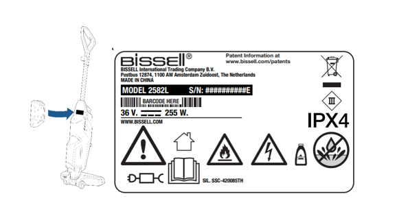 Please search for the model number behind the clean water tank. The number will be listed in a large black bar on the product information sticker - refer to the image below. The affected model numbers are 2582L.