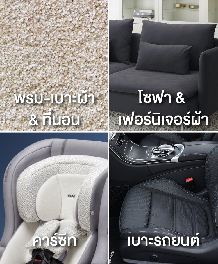 เหมาะสําหรับเฟอร์นิเจอร์ผ้าทั่วไป พรมขนสั้น เบาะผ้า เช่น เบาะรองนอน, ที่นอน, เบาะรองนั่ง, คาร์ซีท, เบาะผ้ารถยนต์, พรมรถยนต์ หรือภายในรถยนต์ที่เป็นผ้า