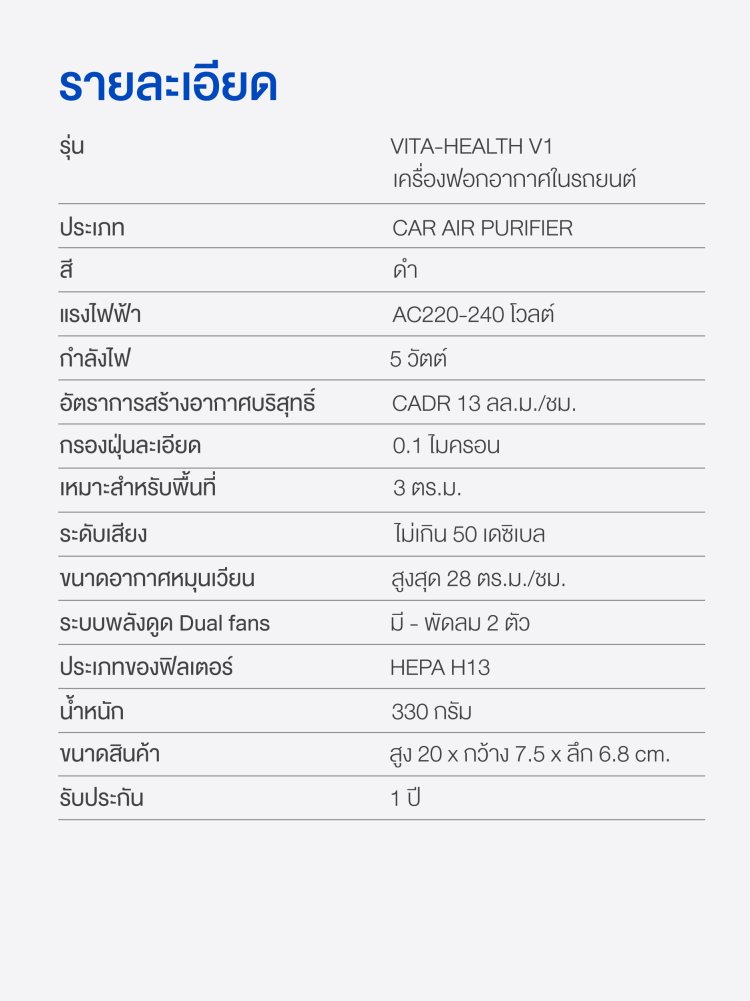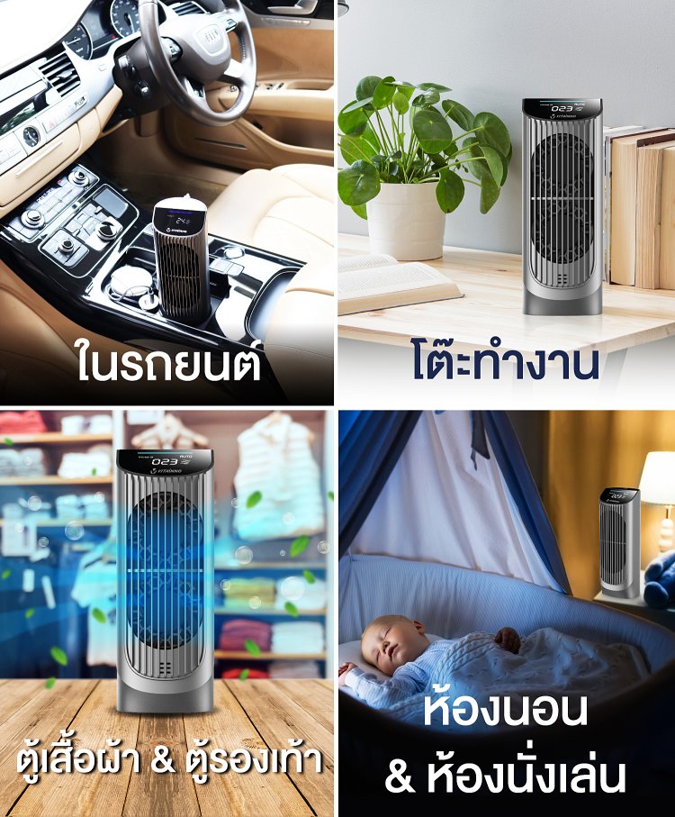 เพื่อให้คุณได้สูดอากาศบริสุทธิ์ตลอดการเดินทางและยังฟอกอากาศในรถยนต์ให้ทั่วถึงเบาะนั่งโดยสารแม่กระทั่งสารระเหยควันไอเสีย แก๊สพิษรวมถึงเชื้อโรคที่ปนเปื้อนมากับฝุ่นละอองสามารถใช้งานได้หลายอเนกประสงค์เพื่อสร้างอากาศบริสุทธิ์ ในโซนบริวณพื้นที่ส่วนตัง โต๊ะทำงาน ครบคลุมพื้นที่ 3 ตารางเมตร